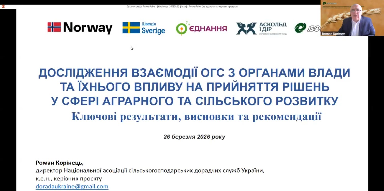 26 березня 2026 року науковці Науково-дослідного інституту «Украгропромпродуктивність» долучилися до онлайн-презентації «Взаємодія організацій громадянського суспільства (ОГС) з органами влади та їхній вплив на прийняття рішень у сфері аграрного та сільського розвитку». Організатором заходу виступила Всеукраїнська громадська організація «Національна асоціація сільськогосподарських дорадчих служб України» (ВГО НАСДСУ).